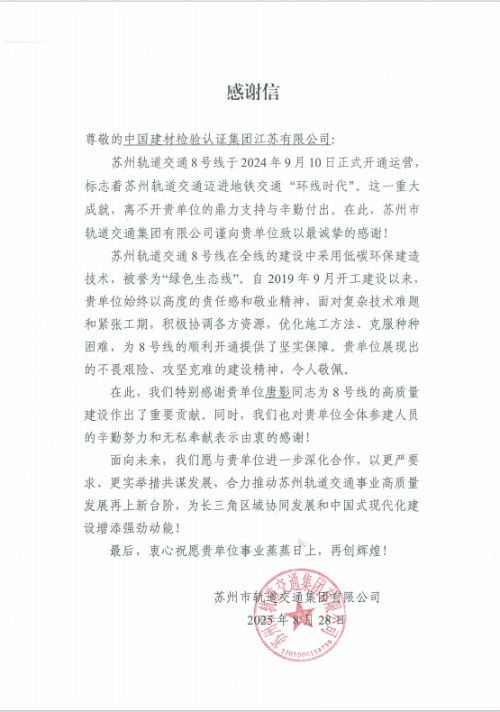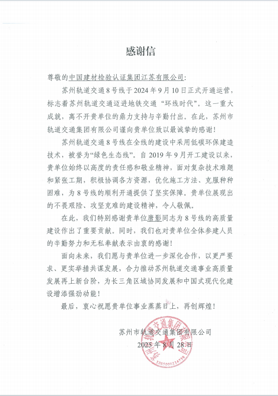 | 感谢信 | 国检集团江苏公司优质技术服务助力苏州轨道交通建设 |